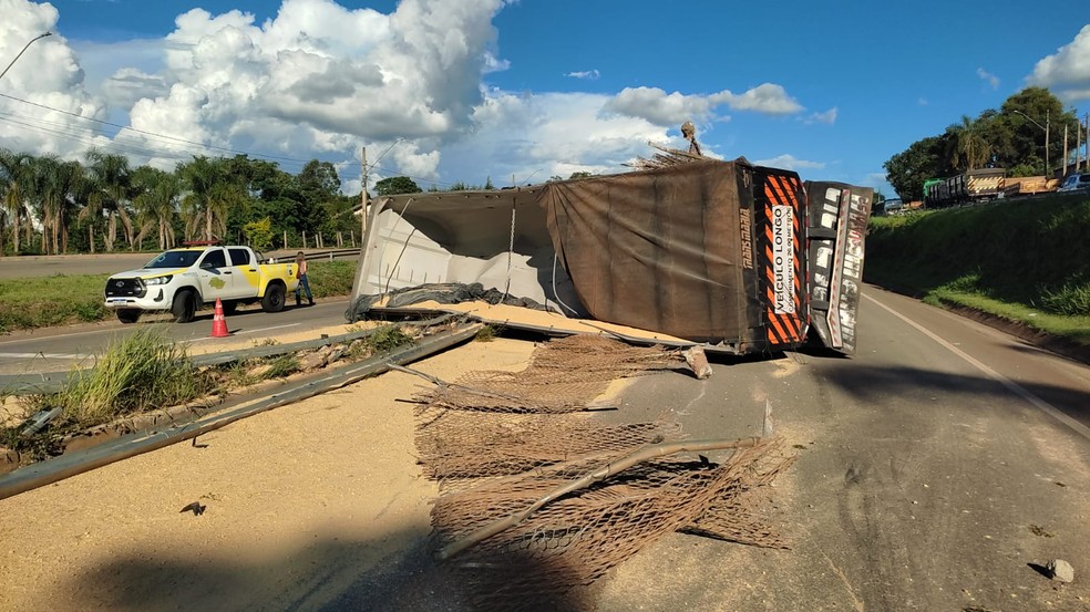 Parte da carga de pó de soja ficou espalhada na pista. A orientação é para que os motoristas redobrem a atenção ao passar pelo quilômetro 195 para evitar novos acidentes.