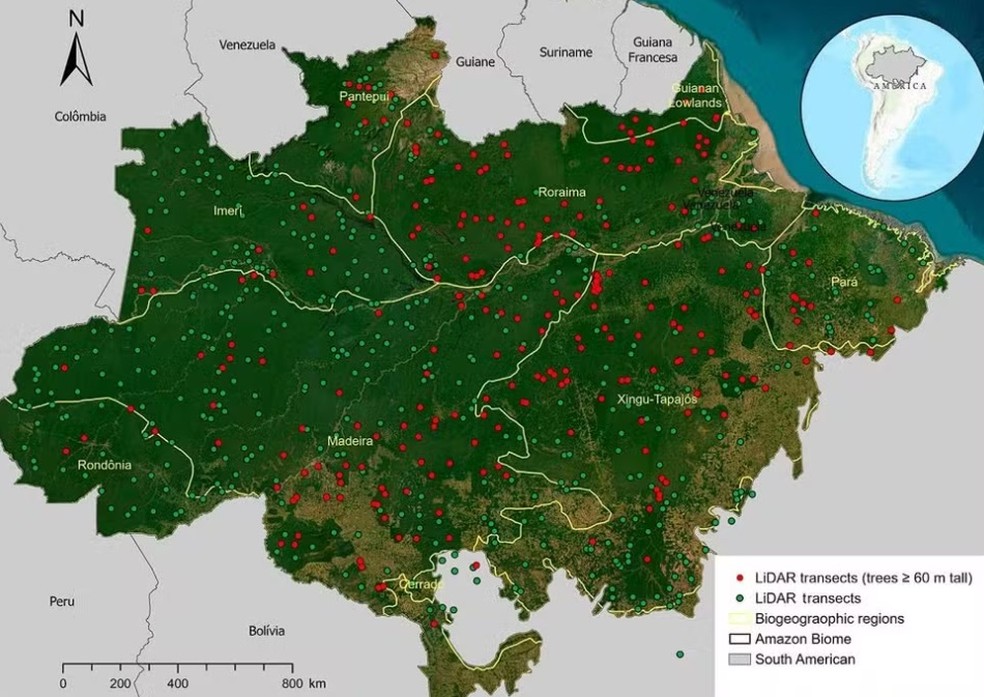 Os cientistas estimam cerca de 55,5 milhões de árvores altas em toda a Amazônia brasileira. E, para mapear e modelar a sua densidade, utilizaram dados de sensoriamento remoto pela tecnologia Light Detection and Ranging (LiDAR), coletados entre 2016 e 2018 em 900 áreas da Amazônia, cada uma com cerca de 3,75 km².