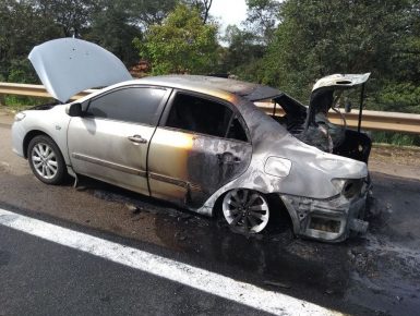 Carro fica destruído após pegar fogo na rodovia Castello Branco