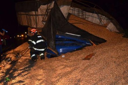 Caminhão capota e motorista fica soterrado em meio a carga de amendoins no interior de SP