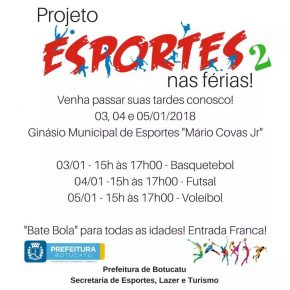 Devido ao sucesso da primeira edição do Projeto “Esportes nas Férias”, no Ginásio Municipal “Mário Covas Júnior”, realizada entre os dias 27 e 29 de dezembro, a Secretaria Municipal de Esportes e Promoção da Qualidade de Vida fará sua segunda edição entre os dias 03 e 05 de janeiro. A iniciativa pioneira da Secretaria tem […]