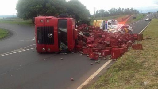 Caminhão carregado com manga tomba em Marília e interdita Rodovia do Contorno