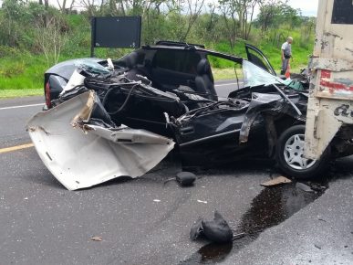 Carro fica destruído após bater em caminhão parado na Rodovia Rachid Rayes
