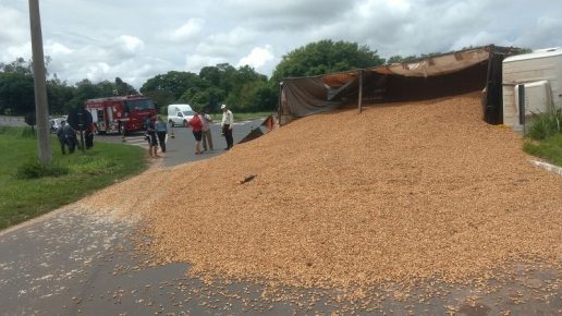 Carreta carregada com amendoim tomba na Rodovia Comandante João Ribeiro de Barros