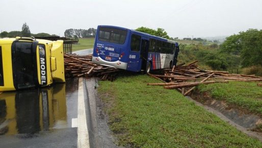 Caminhão com lenha tomba, bate em ônibus e deixa feridos na rodovia Castello Branco