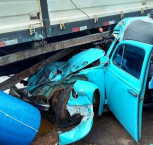 Fusca fica destruído após acidente com caminhão na rodovia Marechal Rondon