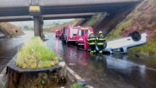 Idoso fica ferido após carro capotar em pista molhada de trevo em Bauru