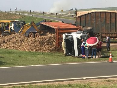Carreta tomba e motorista fica ferido em rodovia de Rio das Pedras