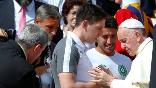 O Papa Francisco recebeu em audiência geral no Vaticano a visita da delegação da Chapecoense nesta quarta-feira. A comissão técnica, os jogadores e os parentes das vítimas da tragédia que deixou 71 mortos no ano passado foram abençoados pelo pontífice. Entre eles, estavam Alan Ruschel e Jackson Follmann — dois dos quatro sobreviventes da tragédia. […]