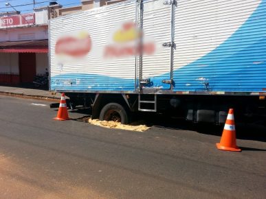 Caminhão fica “atolado” em buraco na área central de Avaré