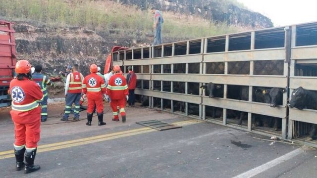 Caminhão com 60 bois tomba e interdita a rodovia BR-153