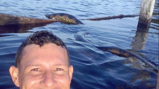 Jovem arrisca ‘selfie’ com cobra anaconda em rio no AM, e foto viraliza