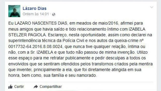 Retratação foi publicada nesta terça-feira no perfil de Lázaro Dias (Foto: Reprodução/Facebook) Um rapaz de 26 anos precisou se retratar publicamente, em sua página no Facebook, depois de inventar que havia se relacionado com uma jovem. O caso aconteceu no Espírito Santo. A retratação foi publicada na tarde desta terça-feira (23), após uma audiência de […]