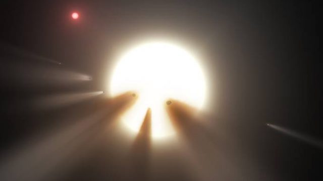 Ilustração feita pela Nasa mostra uma estrela atrás de cometas despedaçados, uma explicação possível para o brilho excêntrico da estrela KIC 8462852 (JPL-Caltech/Nasa) Astrônomos de todo o planeta se mobilizaram neste fim de semana, após detectarem que a estrela KIC 8462852, responsável pela emissão de uma luz misteriosa, voltou a piscar. Os cientistas apontaram seus […]