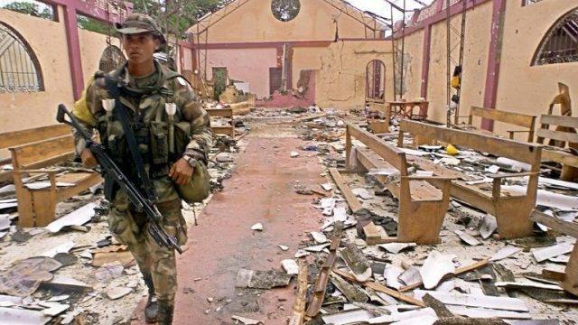 Soldado do Exército da Colômbia caminha pelas ruínas da igreja de Bojayá, no departamento de Choco, em 8 de maio de 2002, destruída por um morteiro caseiro lançado pelas Farc (Foto: Reprodução) As autoridades da Colômbia concluíam, neste domingo (21), a exumação de 57 corpos de vítimas do massacre de Bojayá, cometido pelas Forças Armadas […]