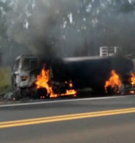 Caminhão-tanque pega fogo na rodovia João Mellão