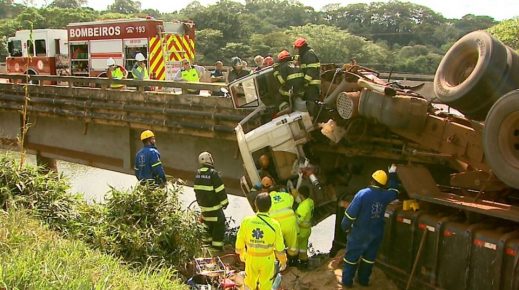 Após acidente, motorista fica preso em caminhão pendurado em ponte no interior de SP