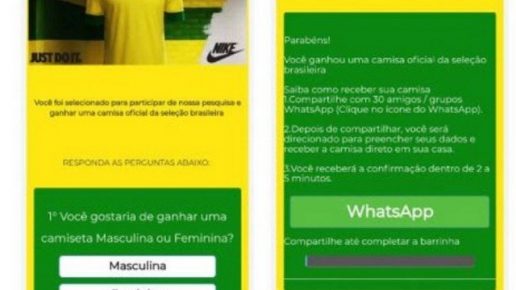 Um novo tipo de golpe começou a circular nos últimos dias entre os usuários do Whatsapp. Uma mensagem promete uma camisa da seleção brasileira para quem compartilhar o que recebeu com ao menos 30 dos seus contatos. Após o compartilhamento, é indicado ao usuário clicar em um link, que o leva a várias páginas externas, […]