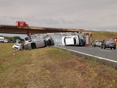Motorista fica ferido após caminhão-cegonha tombar na Rodovia Luiz de Queiroz