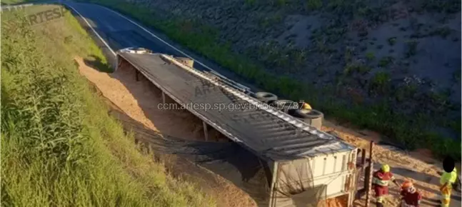 Carreta carregada com serragem tomba e interdita alça de acesso da Rodovia Castello Branco, em Porangaba