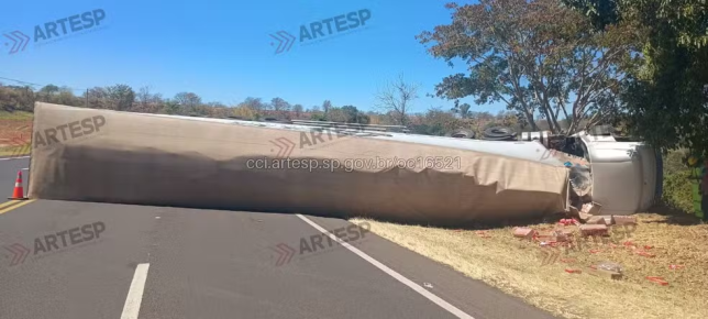 Carreta tomba e interdita via após ser atingida por carro em rodovia no interior de SP; uma pessoa morreu