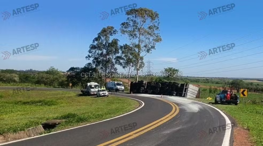 Carreta carregada com toneladas de cimento tomba em rodovia no interior de SP