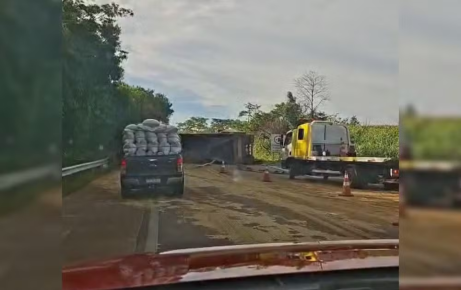 Carreta carregada com farelo de soja tomba e interdita a rodovia SP-304 em Itaju
