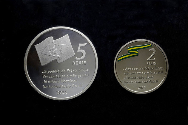 - A de cuproníquel mostra o Grito da Independência, em que D. Pedro, ao receber as cartas da princesa e do ministro José Bonifácio, proclama a Independência do Brasil, às margens do Rio Ipiranga