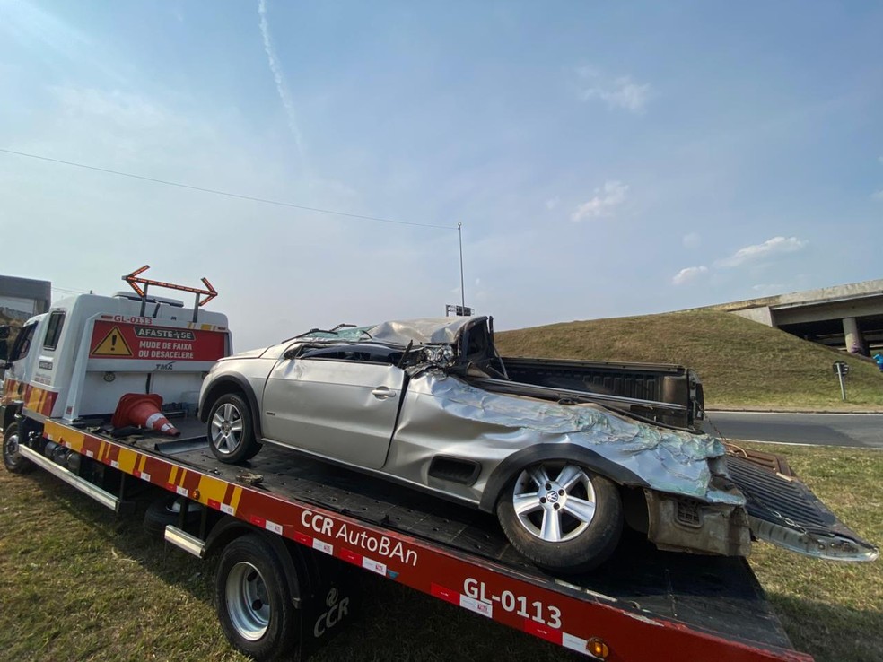 O caminhão tombou em cima do automóvel quando passava embaixo de um viaduto que dá entrada ao bairro Matão, em Sumaré, na altura do Km 112 da Rodovia Anhanguera (SP-330).