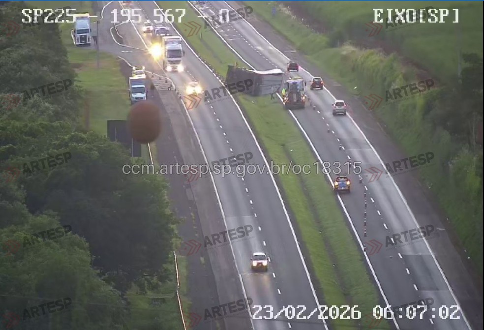 Um caminhão carregado com 15 toneladas de diversos produtos tombou no canteiro central da Rodovia Comandante João Ribeiro de Barros, no km 195, em Itapuí (SP).