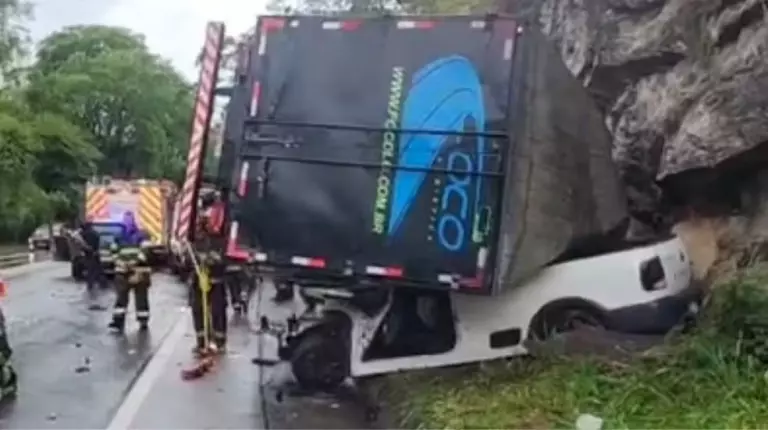 De acordo com as primeiras informações da concessionária que administra o trecho, o caminhoneiro perdeu o controle durante a chuva, invadiu a contramão e tombou sobre uma picape de pequeno porte que trafegava no sentido contrário. O veículo menor foi esmagado pelo caminhão.