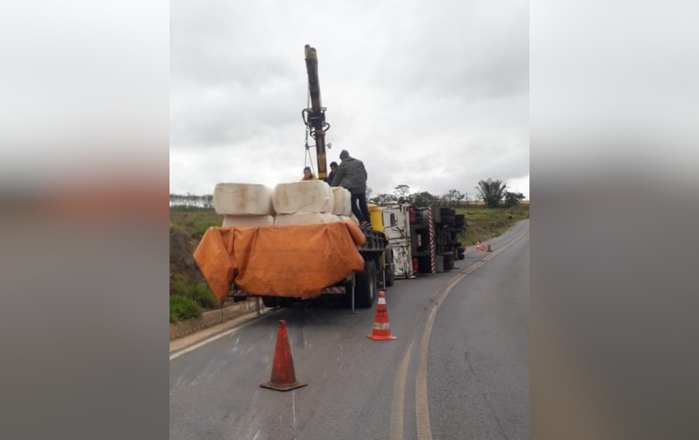 Um caminhão guincho realiza a retirada da carga. O veículo tombado ocupou uma das faixas e ainda um lado do acostamento. Na estrada, a sinalização é feita com cones e auxílio dos agentes.