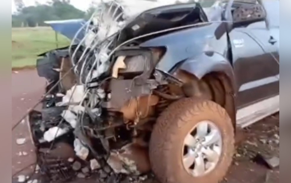 Nas imagens, é possível ver que a frente da caminhonete ficou destruída, assim como parte da estrutura atingida. O veículo foi deixado no acostamento, com o poste caído sobre ele. Também é possível ver que o airbag do volante foi acionado.