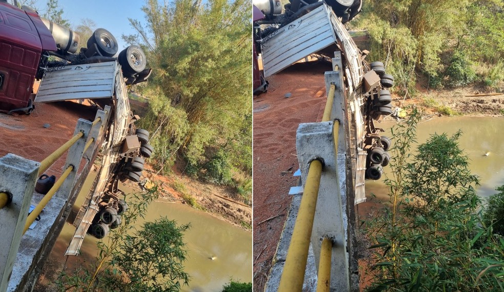 Uma carreta tombou nesta terça-feira (30) na ponte do Rio do Peixe, na vicinal que liga Tupã a Quatá (SP). Após o acidente, o veículo ficou pendurado na ponte. O trecho ficou parcialmente interditado.