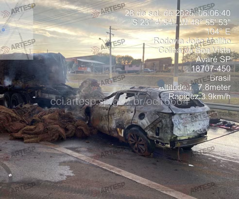 Um motorista morreu após o carro que ele dirigiria pegar fogo ao bater contra a traseira de um caminhão, na Rodovia João Mellão (SP-255), em Avaré (SP), na madrugada de domingo (28).