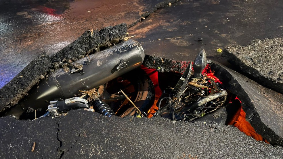 Na Avenida Nações Unidas, na altura da quadra 8, em frente ao Teatro Municipal, a força da enxurrada arrancou parte do asfalto. Pedaços ficaram espalhados pela via, e uma moto chegou a ser “engolida” pelo chão.