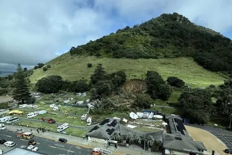 A lama soterrou um bloco de chuveiros em um acampamento localizado aos pés do vulcão extinto Monte Maunganui, como mostram vídeos e fotos divulgados pela mídia local.