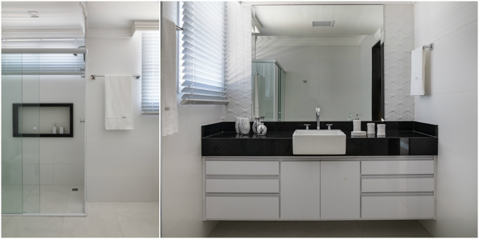 As suítes das crianças foram decoradas de acordo com o gosto e personalidade de cada um. E a suíte dos hóspedes segue uma linha mais neutra, com estampas em formas geométricas tanto nos detalhes do quarto como no revestimento do banheiro.