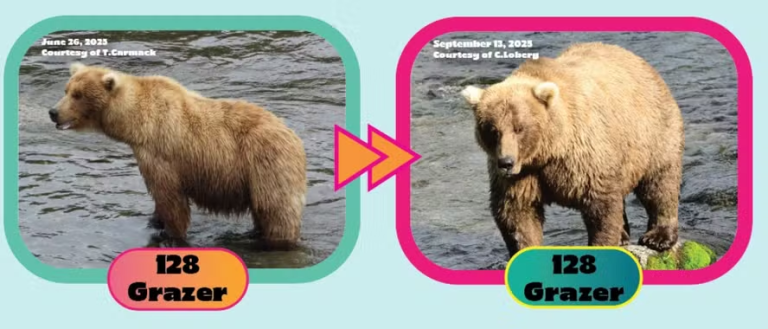 Ao todo, 12 concorrentes participam da competição no Parque Nacional e Reserva Katmai, incluindo “128 Junior”, vencedora da última edição voltada para filhotes. Como um filhote vulnerável na primavera de 2024, ela testemunhou e sobreviveu ao ataque fatal de outro urso contra seu irmão. Desde então, a filhote de Grazer – a ursa bicampeã que busca agora o tricampeonato – prosperou sob a orientação e os cuidados da mãe. Ela cresceu e se tornou uma ursa de um ano que pesa mais de 91 kg.