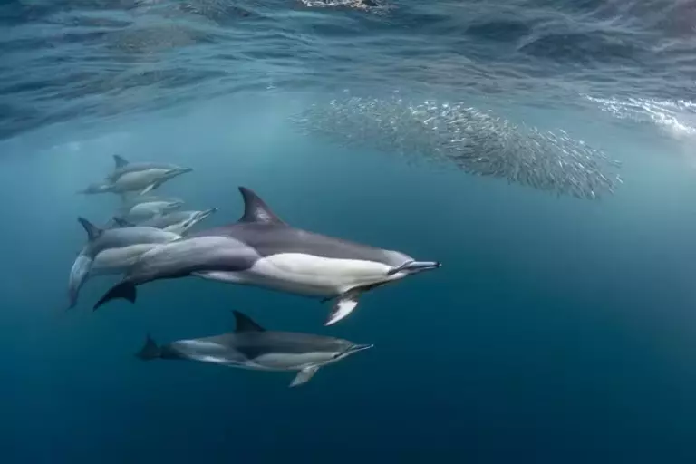 A imagem premiada foi registrada durante a Corrida das Sardinhas, na África do Sul — um fenômeno natural em que cardumes gigantes de sardinhas atraem golfinhos, tubarões e aves marinhas em uma interação espetacular.