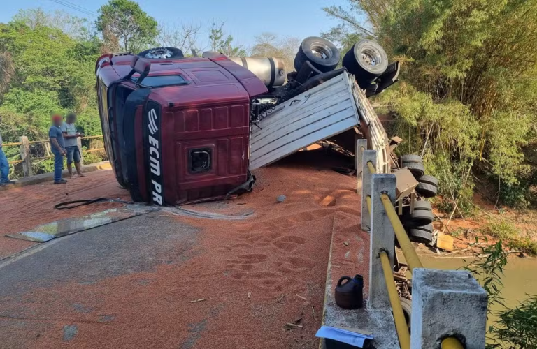 Uma carreta tombou nesta terça-feira (30) na ponte do Rio do Peixe, na vicinal que liga Tupã a Quatá (SP)....