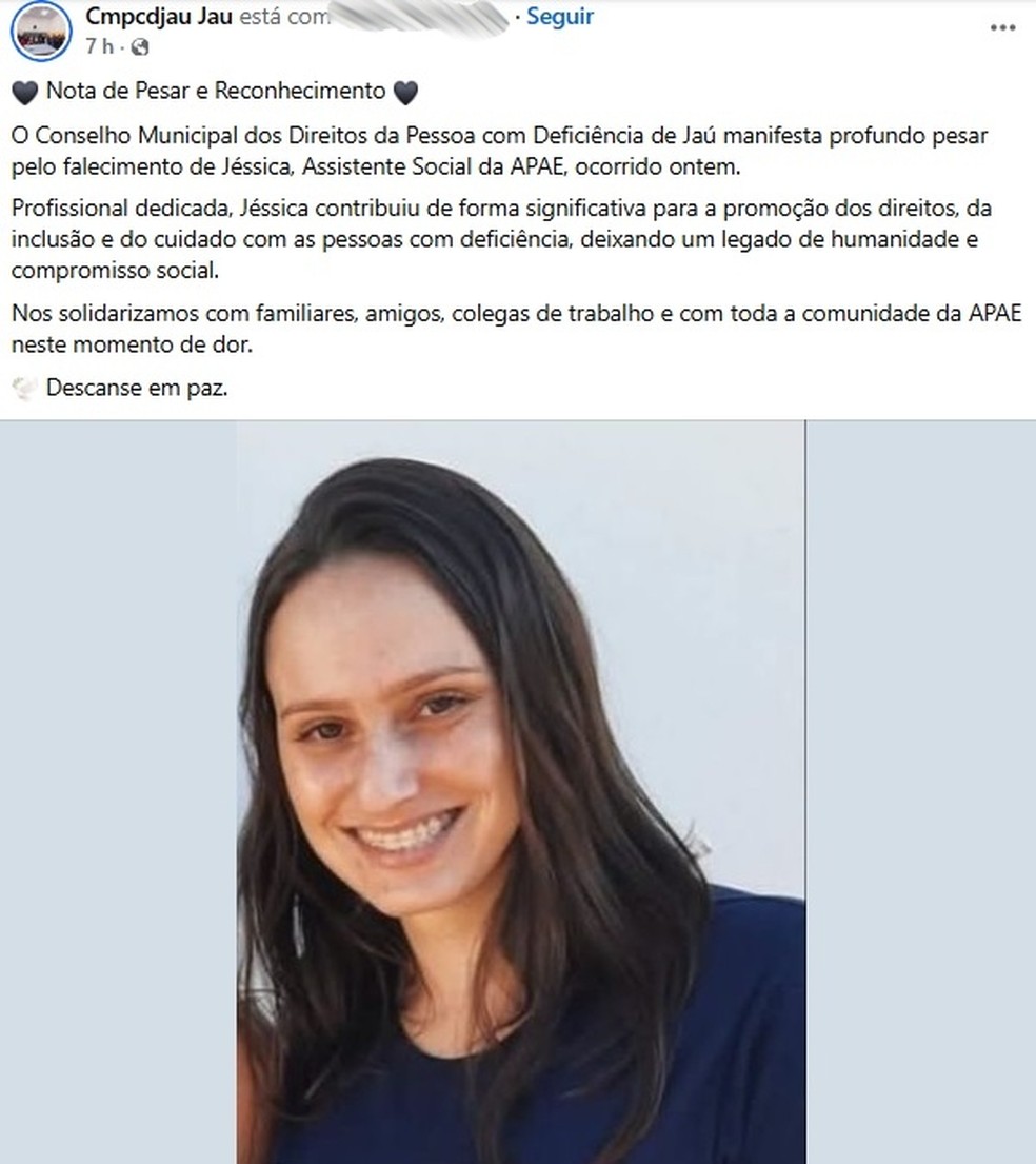 “Profissional dedicada, Jéssica contribuiu de forma significativa para a promoção dos direitos, da inclusão e do cuidado com as pessoas com deficiência, deixando um legado de humanidade e compromisso social”, diz o comunicado.