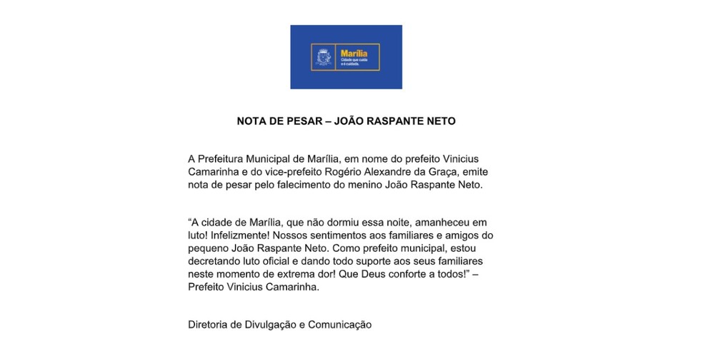 O sepultamento da criança ocorreu às 16h30 desta terça-feira, no Cemitério da Saudade. A prefeitura de Marília decretou luto de um dia na cidade e divulgou uma nota de pesar nas redes sociais.