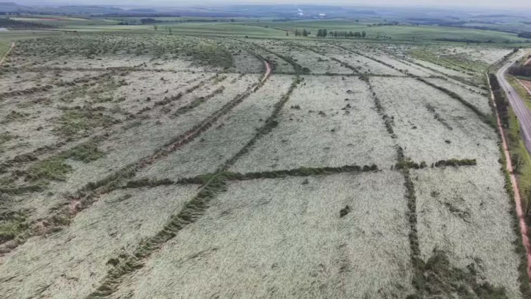 Imagens aéreas feitas no local mostram falhas no canavial, com trechos inteiros da plantação completamente devastados, enquanto áreas vizinhas permaneceram praticamente intactas. A área atingida tem extensão estimada entre dois e três quilômetros.