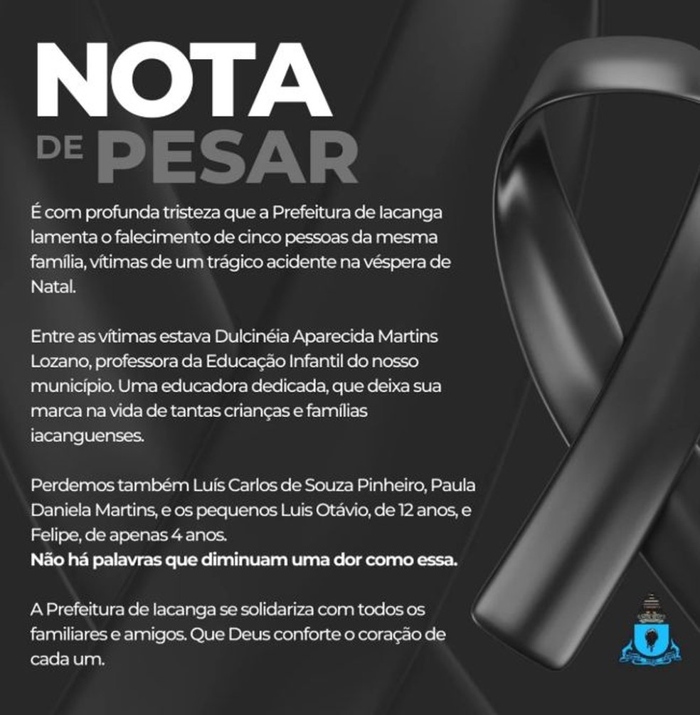 Dulcinéia era professora do ensino infantil do município. A prefeitura publicou uma nota no perfil oficial no Instagram lamentando a morte dela e dos familiares. No texto, a prefeitura diz que o “Natal de Iacanga é de luto”. A postagem recebeu dezenas de comentários e mais de 400 reações. (Veja a nota completa abaixo).