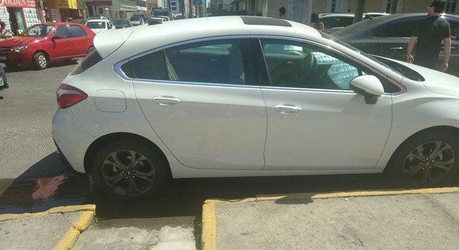 Sem lugar para colocar o carro, o condutor parou o veículo em uma rua com meio-fio pintado de amarelo — o que proíbe o estacionamento.