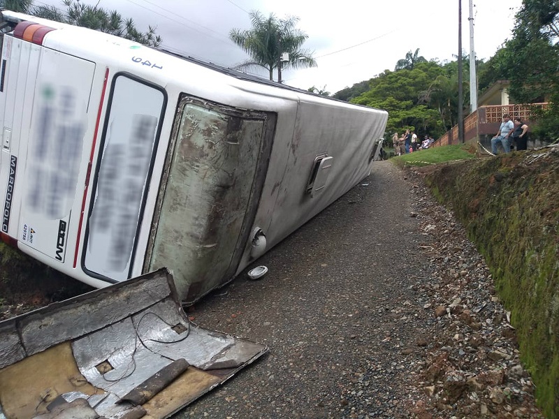 De acordo com os bombeiros voluntários de Joinville, o ônibus e tombou por volta das 14h50 no distrito de Pirabeiraba.