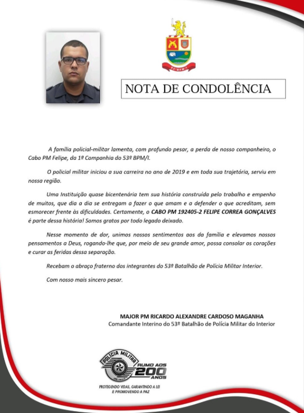 O comandante interino do 53º Batalhão de Polícia Militar do Interior (BPMI), Ricardo Alexandre Cardoso Maganha, publicou uma nota nas rede social oficial da corporação. Na mensagem, ele afirma Felipe deixou um legado que será preservado pelos colegas de farda.