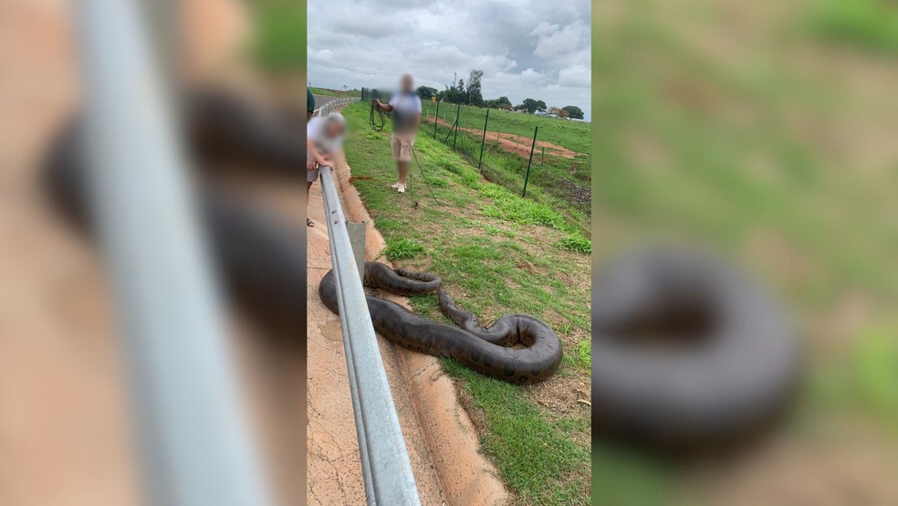 Uma cobra de aproximadamente cinco metros foi flagrada por moradores neste sábado (8) às margens da rodovia Marechal Rondon (SP-300) entre Araçatuba e Guararapes (SP).