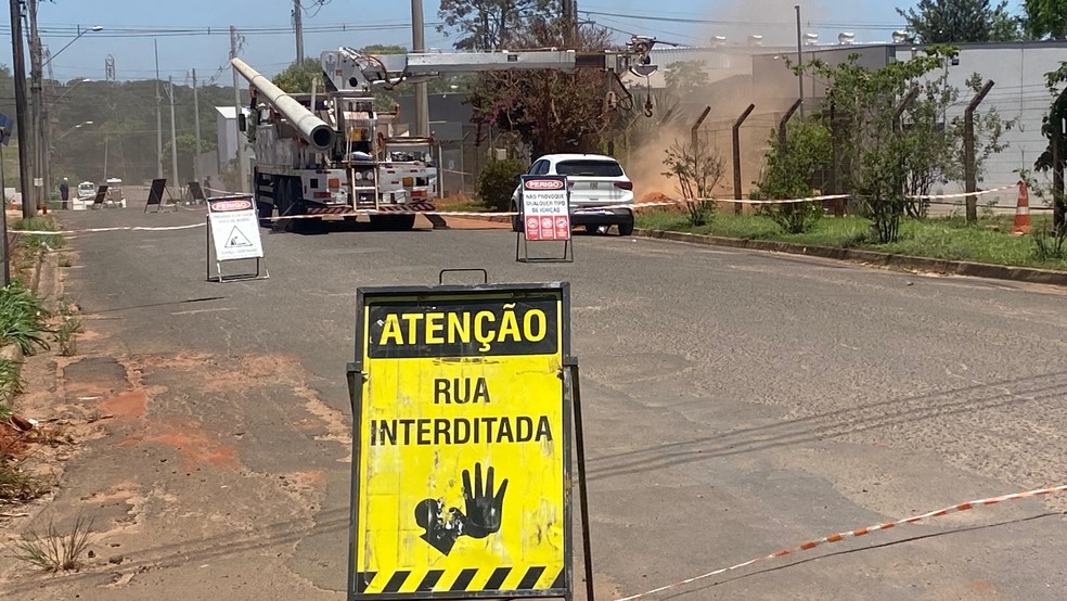 Uma tubulação de gás foi perfurada no fim da manhã desta quinta-feira (20), no Distrito Industrial de Bauru (SP), durante instalação de poste.